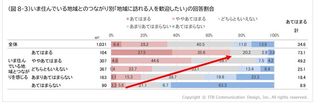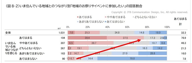 「地域活動に参加したい」「お祭りやイベントに参加したい」「訪れる人を歓迎したい」などのモチベーションは「地域とのつながり感」と最も強く相関