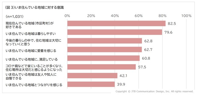 一方、「いま住んでいる地域とつながりを感じる」の肯定割合は39.9%、「いま住んでいる地域は友人や知人に自慢できる」は同42.1%と、相対的に肯定度合いは低い数値です。(図3)