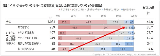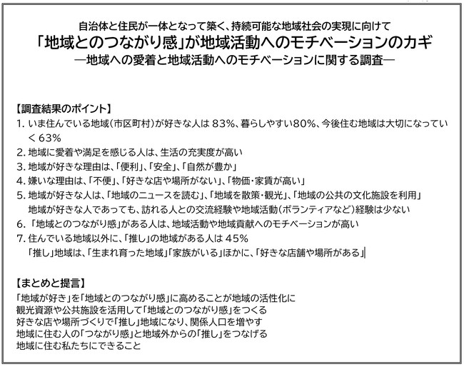 いま住んでいる地域が好き、暮らしやすいと答えた人は全体の83%、今後住む地域は大切になっていくと考える人が63%と地域への高い満足感とその重要性が示されました。またそのように地域への愛着や満足度が高い人は生活全般の充実度も高く、地域と個人の生活との関わりがいかに大きいかも明らかになりました。