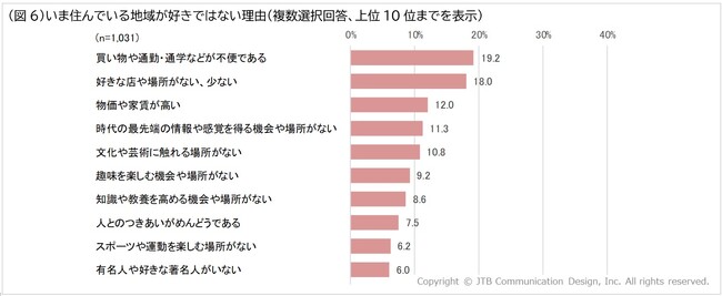 自分が住んでいる地域が好きではない理由は、「買い物や通勤・通学などが不便である」19.2%、「好きな店や場所がない、少ない」18.0%が多く、ついで「物価や家賃が高い」12.0%、「時代の最先端の情報や感覚を得る機会や場所がない」11.3%、「文化や芸術に触れる場所がない」10.8%などとなりました。(図6)