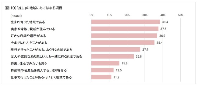 「推し」地域にあてはまる項目を複数選択で聞いたところ、「生まれ育った地域である」38.4%、「実家や家族、親戚が住んでいる」37.6%、「好きな店舗や場所がある」36.9%、「今までに住んだことがある」35.4%、「旅行で行ったことがある」27.4%などが上位となっています。(図10)