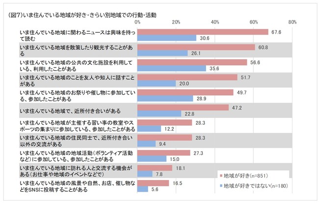いま住んでいる地域が好きな人は、地域に関心があり、地域を散策・観光し、文化施設を利用するなど地域での暮らしを楽しんでいる様子がうかがえますが、訪れる人との交流やSNS投稿、地域のボランティア活動といった一歩踏み込んだ活動までしているケースは少ないようです。