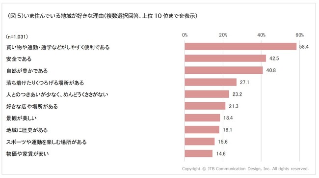5.地域(市区町村)が好きな理由「便利」、「安全」、「自然が豊か」