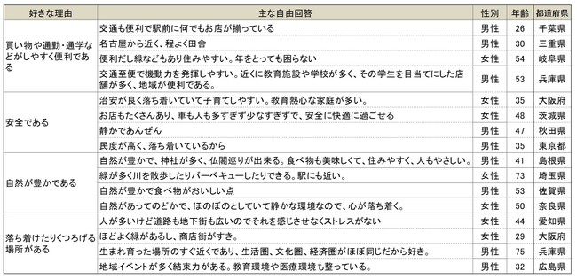 地域を好きな理由について、自由記述で回答を求めました。便利さについては交通や買い物についての内容が多く、年を取ってからのことを考えている記述もありました。安全性については、治安や子育て環境、交通量のほか民度に言及するコメントもありました。自然については、散策や観光、バーベキューなどの楽しさが述べられ、平穏な暮らしが実現していることへの満足感が感じられます。落ち着ける場所に関しては道路、地下街、商店街などの環境のほか、地域イベントを評価するコメントもありました。