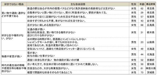地域を好きではない理由について、自由記述で回答を求めました。不便さについては交通と買い物に関する記述が多く見られました。好きな店や場所がないことについては、店が少ないことの他に交通の便が悪いことや過疎化によりシャッター街になっている状況も寄せられました。物価に関しては物の値段の他に給与水準に言及するコメントもありました。時代の最先端の情報がないという点では、考え方の古さや閉鎖性、大きな商業施設がないことなどが挙げられました。
