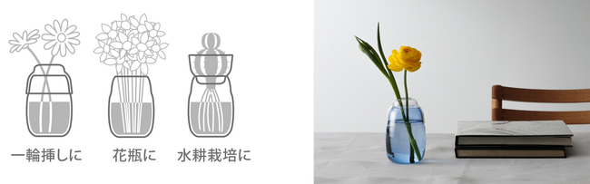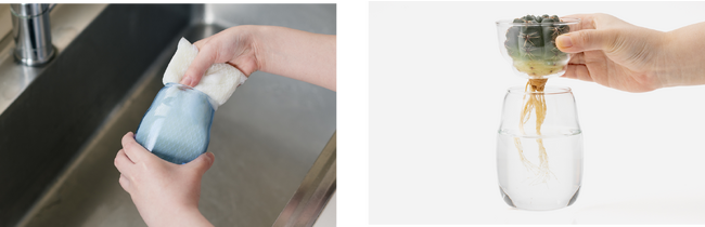 本商品は、企画・開発担当のデザイナーが、日々植物を飾る際に感じていた、【水換えが面倒、一輪挿しは洗いにくい、冬は冷たい水がつらい、植物ごとに専用の花瓶が必要】などの課題に着目し、『簡単に植物を楽しめ、使い勝手の良いフラワーベース』を目指し、開発しました。