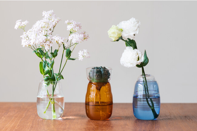 カラーは、空間を選ばず、どんなお花との相性もいい「クリア」、さわやかな印象を与えてくれる「ブルー」、落ち着いた雰囲気で、枝ものやサボテンにもぴったりな「オレンジ」の3色展開です。