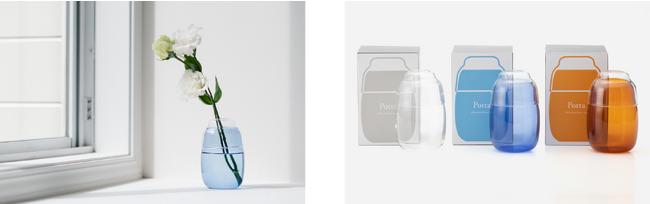 この度発売となる「Potta 3WAY フラワーベース」は、フタの使い方によってさまざまなスタイルで植物を飾ることができるアイテムです。【一輪挿し、花瓶、水耕栽培】の3WAYで使用でき、年間を通して季節ごとの植物をお楽しみいただけます。コンパクトな丸みのある可愛い形状の本体は、耐熱ガラス製でクリア、ブルー、オレンジの3色展開です。