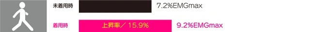 2.早歩きでのウォーキングスピード(6km/h)未着用時:7.2%EMGmax ⇒ 着用時:9.2%EMGmax 上昇率:15.9%