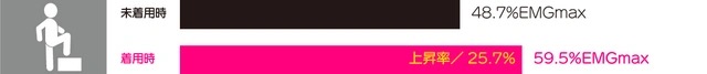 2.踏み台昇降運動(高さ35cm、60秒で3回)未着用時:48.7%EMGmax ⇒ 着用時:59.5%EMGmax 上昇率:25.70%