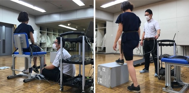 兵庫県立大学の在学生でアメフト部や陸上部、バスケ部など運動部の学生10名(年齢:19~20歳、身長:166.4~180.0cm、体重:59.5~85.9kg)に1.4km/hの歩行、2.6km/hのウォーキングを、体幹スクワットスパッツの着用時と未着用時でそれぞれ試験をし、大腿前部(大腿直筋・外側広筋)の筋活動量の違いを検証しました。