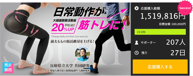 大人気プロジェクト「体幹スクワットスパッツ」が、目標達成率5,324%の応援購入金額532万円を達成しました。その中でお客様からいただいた嬉しいご要望にお応えし、待望のロングバージョンがMakuakeにて先行販売開始し開始わずか1時間で目標金額達成しました!