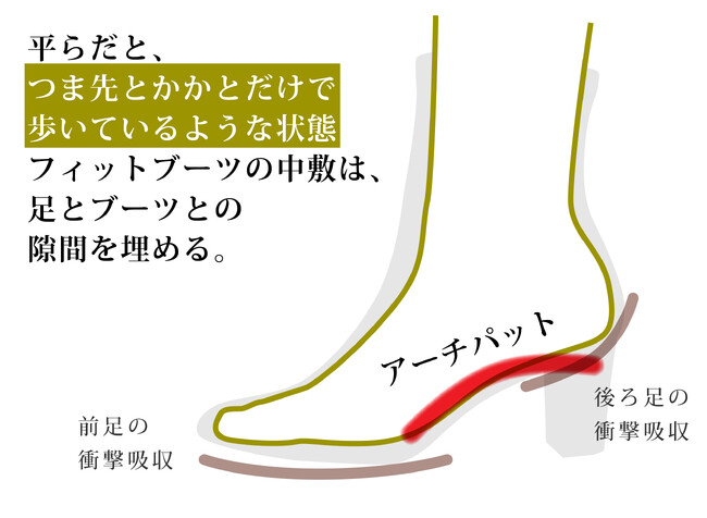 また、土踏まず部分に低反発素材のパッドを入れることにより、足とブーツの隙間を埋めています。これがストッパーの役割も担っており、ブーツの中で足が前に滑りにくくなります。