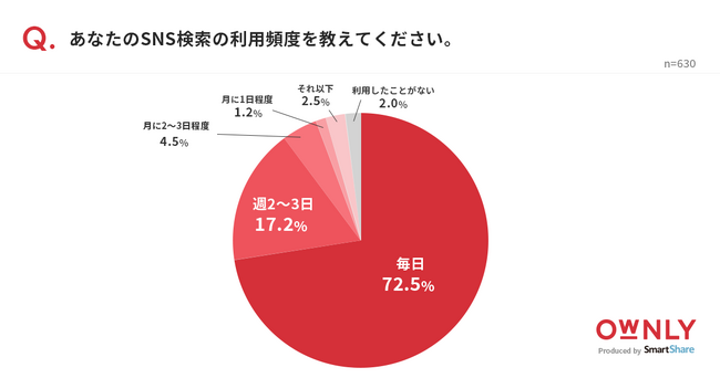 全年代において「毎日」SNS検索を利用するという回答が72.5%、「週2~3日」が17.2%でした。SNSは人々の生活に深く根付いていると考えられます。