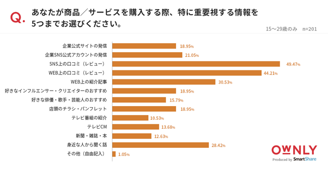 15~29歳の回答者に絞ると、SNS上の口コミを参考にする回答が最も多く49.47%でした。Z世代によって情報収集はSNSが主流となったことがわかりました。
