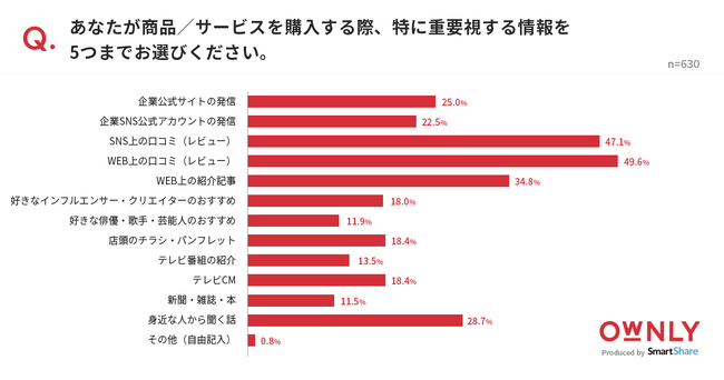 約5割の回答者が商品/サービスを購入する際に、WEBサイトやSNS上の口コミ(レビュー)を参考にすると回答しています。また、「WEB上の紹介記事」が34.8%で、「身近な人から聞く話」が28.7%という結果から、購買行動において口コミと他人の意見を参考にしていることがうかがえます。