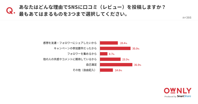 投稿する理由に関する設問では、「自己満足」が一番多く、次に「キャンペーンの参加要件だったから」が35.0%という結果となりました。ユーザーの口コミ投稿の促進には、「口コミを投稿すると抽選に参加できる」「口コミを投稿すると公式アカウントにシェアされる」などのきっかけを投稿キャンペーンで作ることが有効的だと考えられます。