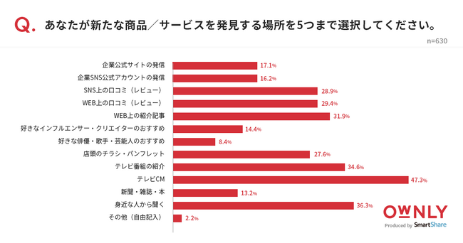 新たな商品/サービスを発見する場所のアンケート結果では、「テレビCM」や「テレビ番組」という回答が最も多いですが、約3割の対象者がSNS上の口コミを通して新商品を発見することがうかがえます。