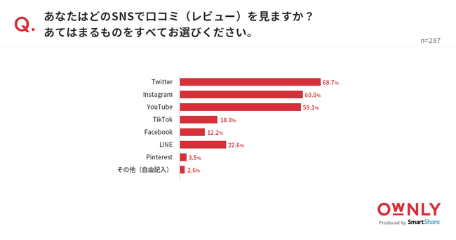 「SNS上の口コミ(レビュー)」と回答した方の中で、「Twitter」で口コミを見るという回答が最も多く68.7%でした。「Instagram」で口コミを見る回答者が60.0%で2位につけています。幅広い年齢層のユーザーにとって馴染みのあるTwitterは匿名性という特徴があり、より本音に近い口コミ投稿が多いと思われます。また、画像や動画から情報を汲み取るユーザーも増えているため、InstagramとYouTubeなどビジュアルに特化している媒体もよく利用されているとうかがえます。