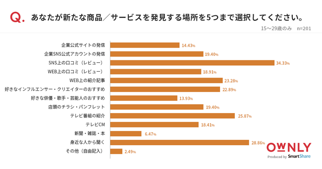 15歳から29歳までの世代に絞ると、「SNS上の口コミ(レビュー)」という回答が最も多く34.33%でした。「Z世代」と呼ばれる若い世代は子供の頃からSNSが世の中に浸透しており、SNSの利用率が95%以上という調査結果もありました。利用率の高さと利用時間の長さは、新たな商品を発見するチャンスの増加につながっていると思われます。