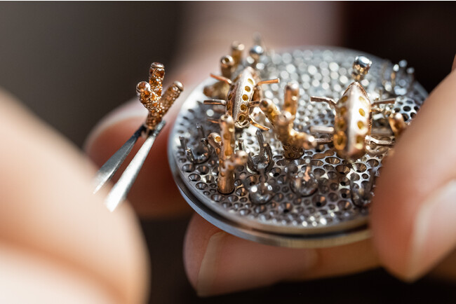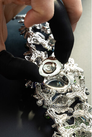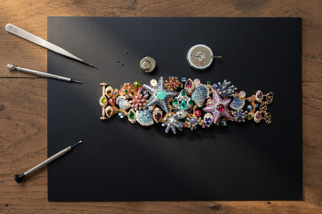 「ジャルディーノ マリーノ ピッコロ」は、魚やイソギンチャク、貝殻をダイヤモンド、エメラルド、サファイア、パライバトルマリン、タンザナイト、グリーントルマリン、ツァボライト、トパーズ、ペリドットで表現しながら南イタリアをイメージした鮮やかなカラーパレットを形づくっています。ブルーとグリーンのグラデーションが見事な美しさを放つ透き通ったトパーズの下には、ラウンド型機械式マイクロムーブメント「ピコリッシモ」を備えたウォッチのダイヤルが収められています。