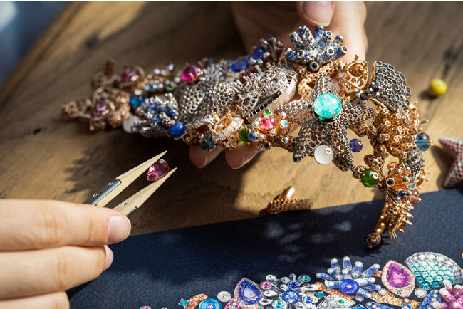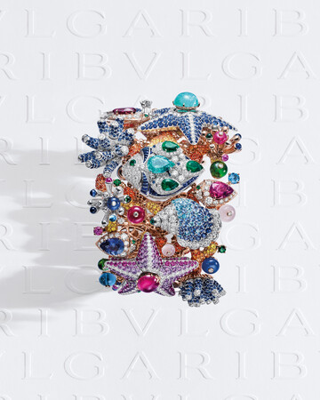 ブルガリの熟練の職人とジュエラーが力を合わせ、思いがけない宝物や生き生きとした活気と喜びを感じさせるサンゴ礁に彩られた海底の庭園に命を吹き込みました。