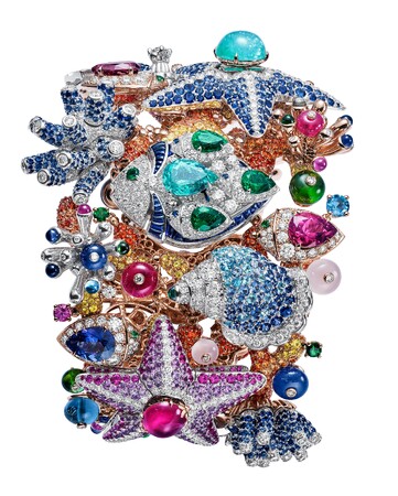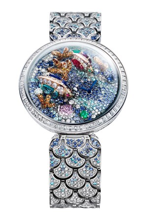 ケース/ダイヤル:径38mmホワイトゴールド製ケース、パライバ(約0.71ct)、ブルーサファイア(約2.18ct)、2石のエメラルド(約0.17ct)、ダイヤモンド(約1.75ct)、イエローサファイア(約0.19ct)をセットしたダイヤル、ルベライト(約0.31ct)とルビー(約0.4ct)、ブルーサファイア(約0.85ct)とパライバ(約0.67ct)の魚、ピンクサファイア(約0.2ct)の貝、マンダリンガーネット(約1.89ct)製のイソギンチャク、バゲットカットダイヤモンド(約2.3ct)を施したベゼル、スノーセッティングダイヤモンド(約1.33ct)をセットしたミドルケース
