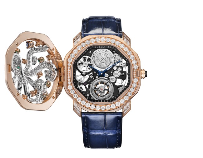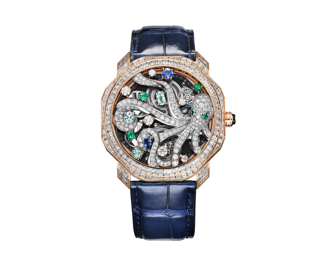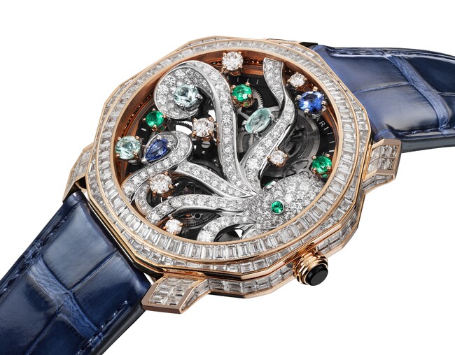 「オクト ローマ メディテラニア シークレットウォッチ」は、創造力と比類なき職人技により作り出されたオクトパスのプレシャスな輝きが目を惹きつけるタイムピースです。ダイヤモンド、サファイア、エメラルド、パライバトルマリンで形作られたオクトパスは奥へ後ずさりながら今にも触手をこちらに伸ばしてくるかのような躍動感を 感じさせます。ダイヤモンドがあしらわれた径44mmのピンクゴールド製ケースにブルーのアリゲーター製ストラップを備え、ダイヤモンドと色石が瞬くカバーからはフライングトゥールビヨン搭載の超薄型手巻きムーブメントのキャリバーBVL268SKが時を刻む様子がうかがえます。