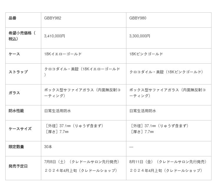 セイコーウオッチ株式会社(代表取締役社長:内藤 昭男、本社:東京都中央区)は、セイコーにおける薄型メカニカルウオッチの原点<ゴールドフェザー>を、60 余年ぶりに<クレドール>の名の下に蘇らせます。限定モデル1機種を7月8日(土)より発売、希望小売価格は3,410,000 円(税込)です。続けて、レギュラーモデル1機種を8 月11 日(金)より発売、希望小売価格は3,300,000 円(税込)です。