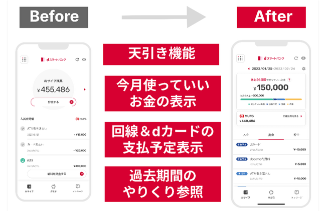 今回のリニューアルにより、お客さまが設定した任意の給料日(任意で設定した集計期間の開始日)を起点として、当月の入出金に加えて、ドコモの回線料金や「dカード(R)」の支払予定額を自動で集計した残高表示が可能になり、次の給料日までに使っていいお金が一目でわかり、より便利にお使いいただけます。