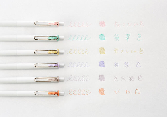 このたび発売する『ユニボール ワン 和テイストカラー』は、和をイメージしたニュアンスカラーの新色です。ふんわりとしたテイストで、ユーザーがペンを使用する時間を和やかに彩ります。『ユニボール ワン』シリーズの特長である視認性の高いインクにより、淡くはかない色合いでありながら洗練された線を描きます。インク色名は、和菓子や日本の花などをモチーフに名づけました。