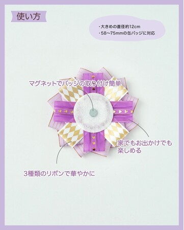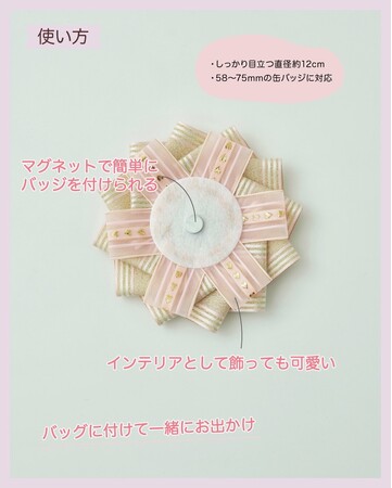 贅沢に3種のリボンを重ねたロゼットです。甘すぎず、インテリアにもお出かけにも使いやすい大人なデザインです。華やかなゴールドとのカラーリングが推しの魅力を引き立てます。