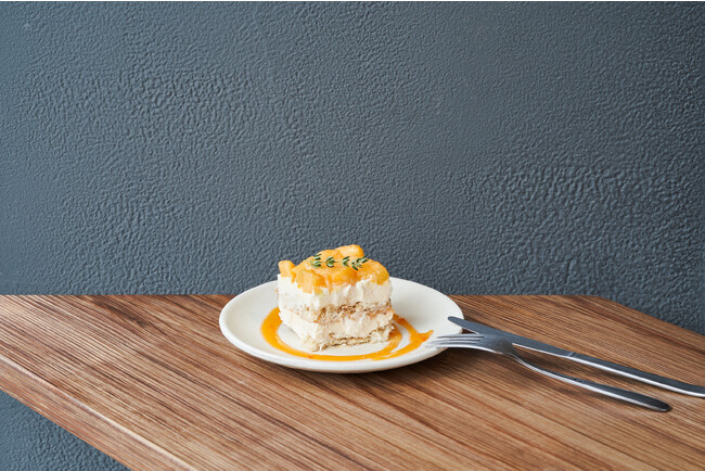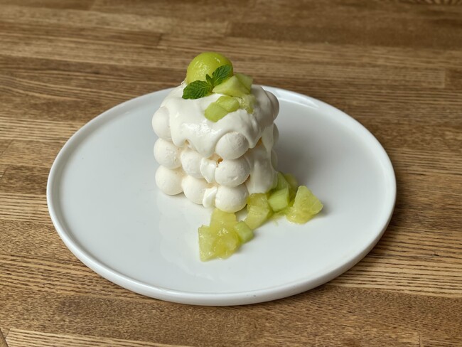 メロンとマスカルポーネを使ったオリジナルクリームをしっとりと焼き上げたパイ生地でサンドした「ティラミス x ミルフィーユ」のオリジナルスイーツ。贅沢に赤肉メロンをトッピングし、パイ生地の塩味とメロンの甘みが相性抜群です。