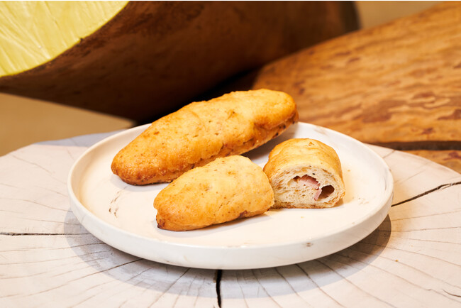 食パン生地にフライドオニオン、シュレッドチーズ、ブラックペッパーを練り込み、スライスベーコンを巻き、トッピングにパルメザンチーズを使用したお惣菜系メロンパンです。