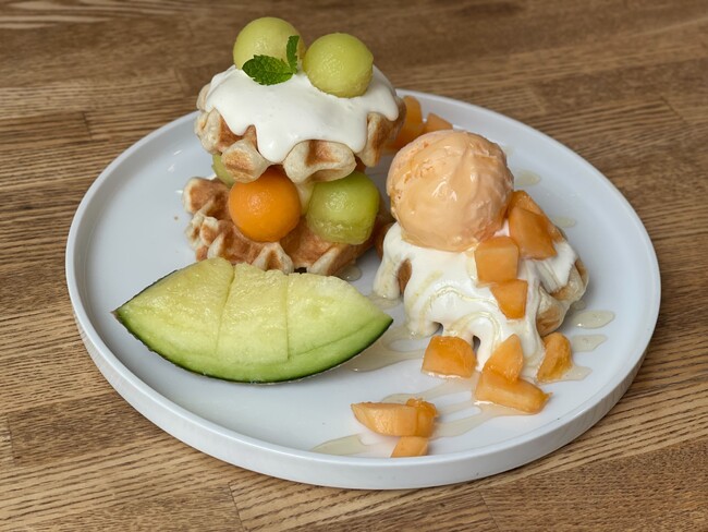 人気食パン「ムー」の生地をワッフル型で焼き上げた「ムッフル」は当店の人気スイーツ。自家製メロンクリーム、北海道メロンアイス、メロン果肉と合わせ、甘くてジューシーな果肉が特徴の「肥後グリーンメロン」と「赤肉メロン」を贅沢に使用。今の季節しか味わえないメロンをお楽しみください。