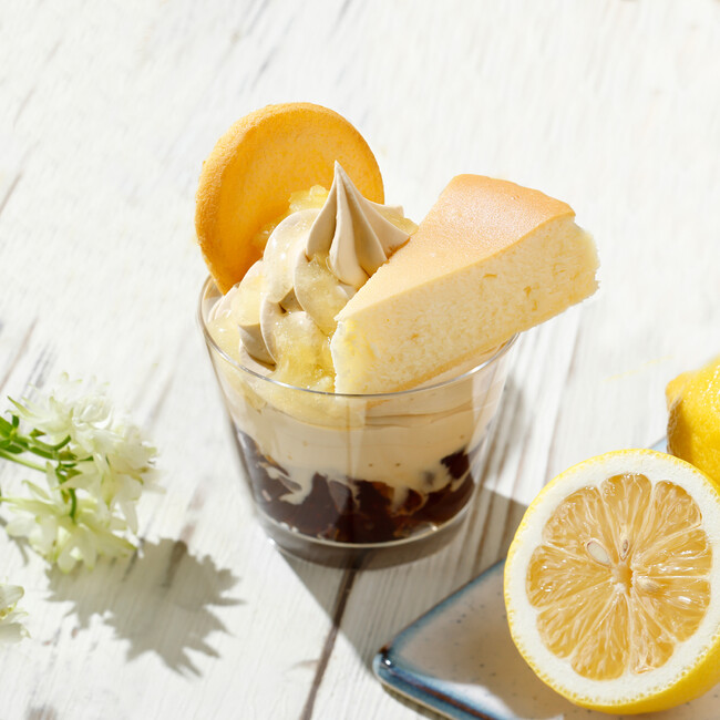 チーズケーキとチーズクッキーをのせたサンデーに、季節限定フレーバー『チーズケーキサンデーレモン』が新登場します。程よい甘さと華やかな香りひろがる紅茶ゼリーにベイクドチーズケーキの風味がお楽しみいただけるチーズソフトクリーム、季節フレーバーの『御用邸レモンチーズケーキ』『御用邸レモンチーズクッキー』をのせて、レモンピール入りのピューレをトッピングしました。濃厚なチーズソフトクリームと紅茶の華やかな香りひろがる紅茶ゼリーに、レモンピール入りのピューレをあわせて食べることでレモンティーのような爽やかな味わいがお楽しみいただけます。そして季節フレーバーである、『御用邸レモンチーズケーキ』と『御用邸レモンチーズクッキー』も一緒に楽しむことができる贅沢なスイーツです。