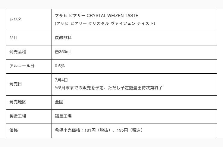 アサヒビール株式会社(本社 東京、社長 松山一雄)は、飲み方の多様性を提案する「スマートドリンキング」の考え方に基づき展開しているアルコール分0.5%の“微アルコール”ビールテイスト飲料「ビアリー」ブランドの期間限定商品『アサヒ ビアリー CRYSTAL WEIZEN TASTE(クリスタル ヴァイツェン テイスト)』を7月4日から発売します。