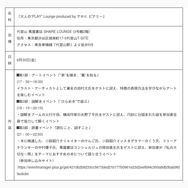 6月30日には、代官山 蔦屋書店で『大人の“PLAY” Lounge produced by アサヒ ビアリー』 を開催します。アルコール分0.5%の“微アルコール”ビールテイスト飲料「アサヒ ビアリー」とともに好きなことに向き合う自分だけの時間や心地よいひとときを提案するイベントです。本イベントを通して、お客さまの体質や気分、シーンに合わせて適切なドリンクを選択できる環境づくりを推進します。