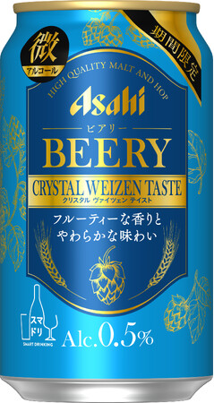 『アサヒ ビアリー CRYSTAL WEIZEN TASTE』は0.5%のアルコール分ながら、ヴァイツェンビールのようなフルーティーな香りとやわらかな味わいが特長のビールテイスト飲料です。アルコールを除去する脱アルコール技術により、ビール特有の発酵由来の複雑な香気成分を残しています。パッケージは夏らしさを感じる青色をベースに「ビアリー」ブランドのロゴやホップのイラストと、商品特長である“フルーティーな香りとやわらかな味わい”の文言を記載しました。