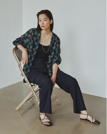 オープンカラーの抜け感のあるブラウスは、オーバーサイズシルエットで、空気をはらんだような軽やかさが魅力。袖口にはギャザーをふんだんにあしらい、やわらかな素材をいかしたボリュームスリーブに。