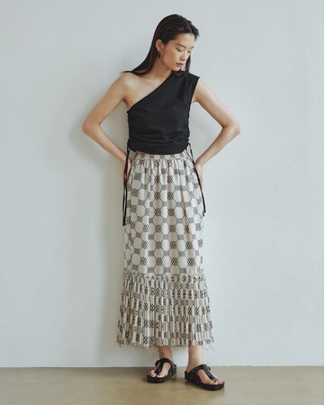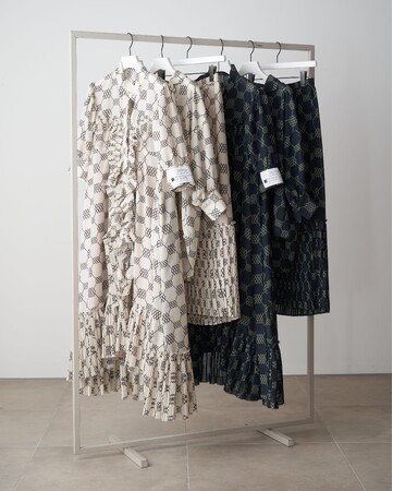 今季はジオメトリックパターンをレタリング調に落とし込んだドレス、シャツ、スカートの3型がラインアップ。
