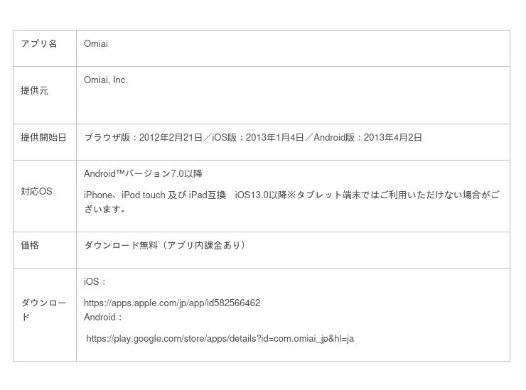 『Omiai』は、婚姻率低下や少子化といった社会課題を背景に、2012年2月に国内でサービス提供を開始した男女の出会いをサポートするマッチングアプリです。サービス開始以降、出逢いを探す多くの男女に支持され、これまでの累計会員数は900万人を超えました(*)。「一般社団法人結婚・婚活応援プロジェクト(MSPJ)」に参画し、業界全体の活性化にも取り組んでいるほか、多くの方の幸せ探しに貢献できるよう、顧客に寄り添ったサービス運営を行ってまいります。*2023年2月時点
