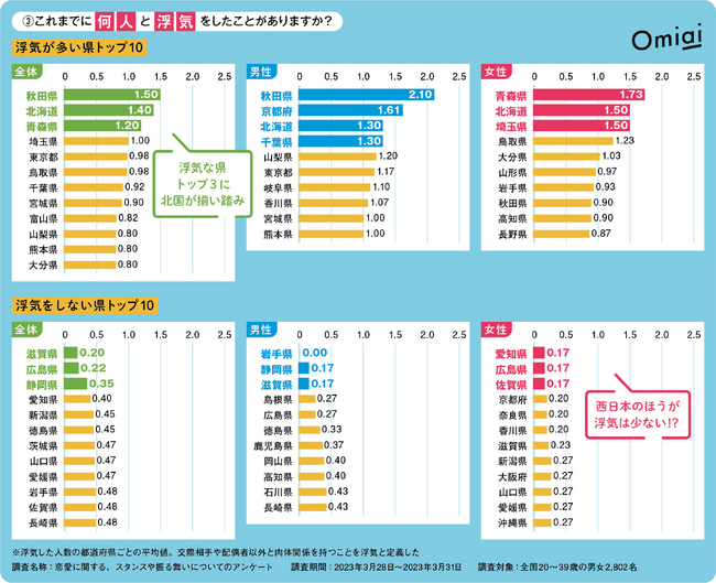 「これまで何人と浮気したことがあるか」を各県で調査してみると、全体ランキングでは1位が秋田県(平均1.50人)、2位が北海道(平均1.40人)、3位が青森県(平均1.20人)という結果に。最も浮気傾向にあるのが秋田県の男性で、平均2.10人という数字に。また、女性部門では青森県がトップで、平均1.73人という結果が出ました。