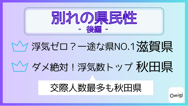 前編に引き続き、“別れ”をテーマに、全国20~39歳の男女2,802名を対象とした「恋愛に関する、スタンスや振る舞いについて」のアンケート調査から県別ランキング*を作成。後編では、とても気になる「浮気性」な県のランキングを発表します。