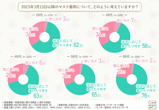今後、マスクの着用が個人の判断に委ねられることになりますが、どの年代においても「状況に応じて着けたり外したりする」と回答した方の割合が6割~7割程度となったことから、感染状況の様子を見ながら慎重に、という方が多いのではないでしょうか。