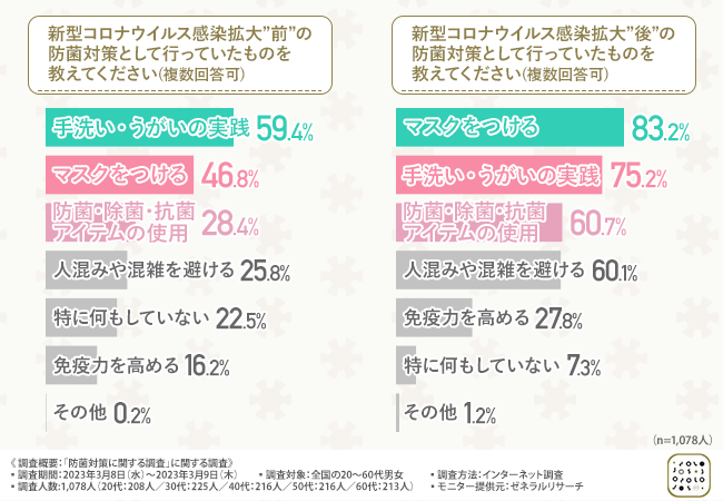 WHOの発表から3年が経過しましたが、新型コロナのパンデミックによって、細菌やウイルスに対する防菌(抗菌・抗ウイルス)意識が高まったという方が多いかと思いますが、実際に新型コロナの感染拡大前と後を比較すると、意識にどのような違いが生じたのでしょうか。