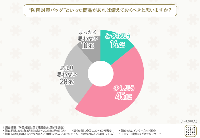 そこで、「“防菌対策バッグ”といった商品があれば備えておくべきと思いますか?」と質問したところ、『とても思う(14.4%)』『少し思う(45.8%)』『あまり思わない(28.9%)』『まったく思わない(10.9%)』という回答結果になりました。