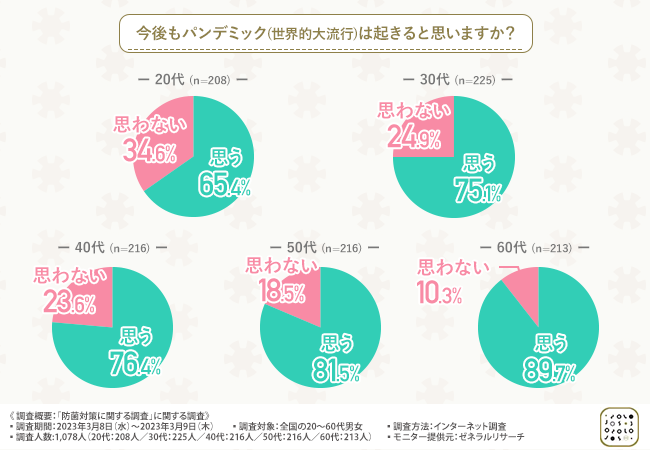 そこで、「今後もパンデミック(世界的大流行)は起きると思いますか?」と質問したところ、年代別の結果は下記の通りとなりました。