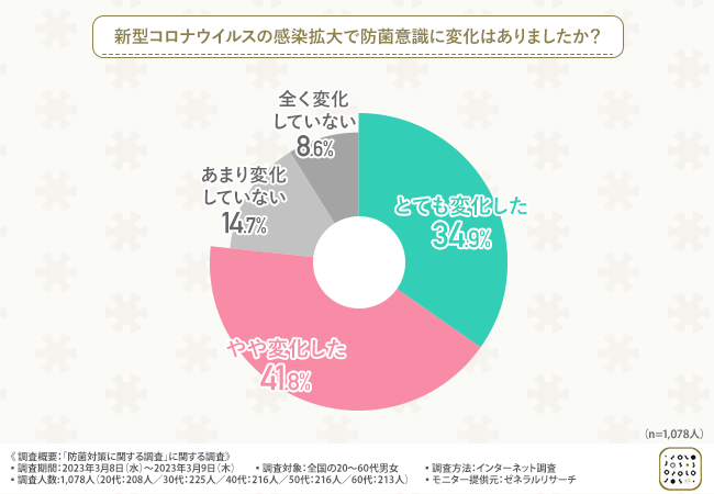 「新型コロナウイルスの感染拡大で防菌意識に変化はありましたか?」と質問したところ、『とても変化した(34.9%)』『やや変化した(41.8%)』『あまり変化していない(14.7%)』『全く変化していない(8.6%)』という回答結果になりました。