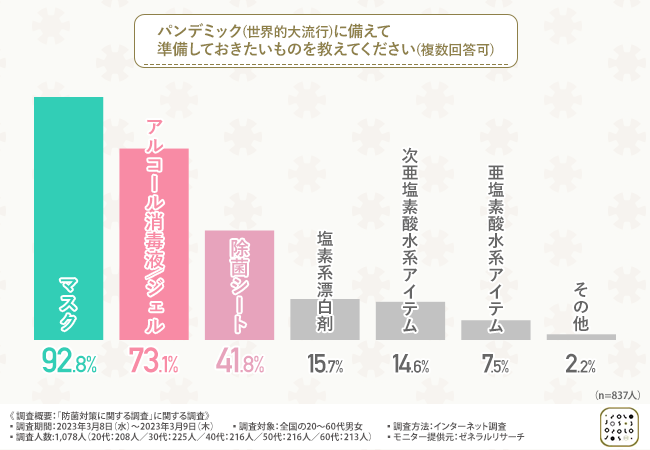 「パンデミック(世界的大流行)に備えて準備しておきたいものを教えてください(複数回答可)」と質問したところ、『マスク(92.8%)』と回答した方が最も多く、次いで『アルコール消毒液/ジェル(73.1%)』『除菌シート(41.8%)』『塩素系漂白剤(15.7%)』『次亜塩素酸水系アイテム(14.6%)』『亜塩素酸水系アイテム(7.5%)』と続きました。